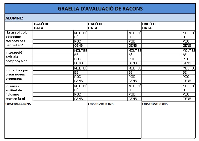 Per avaluar aquesta activitat, la mestra observarà cada infant en cada tipus d'exercici per a comprobar si ha assolit el concepte requerit. Disposarà d'una llibreta d'anotacions amb una graella on podrà anotar-ho: